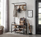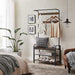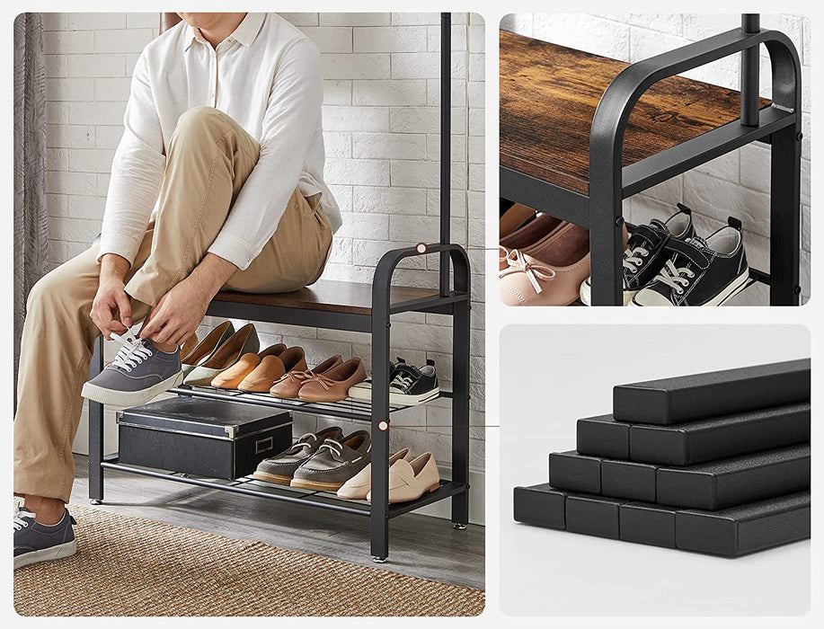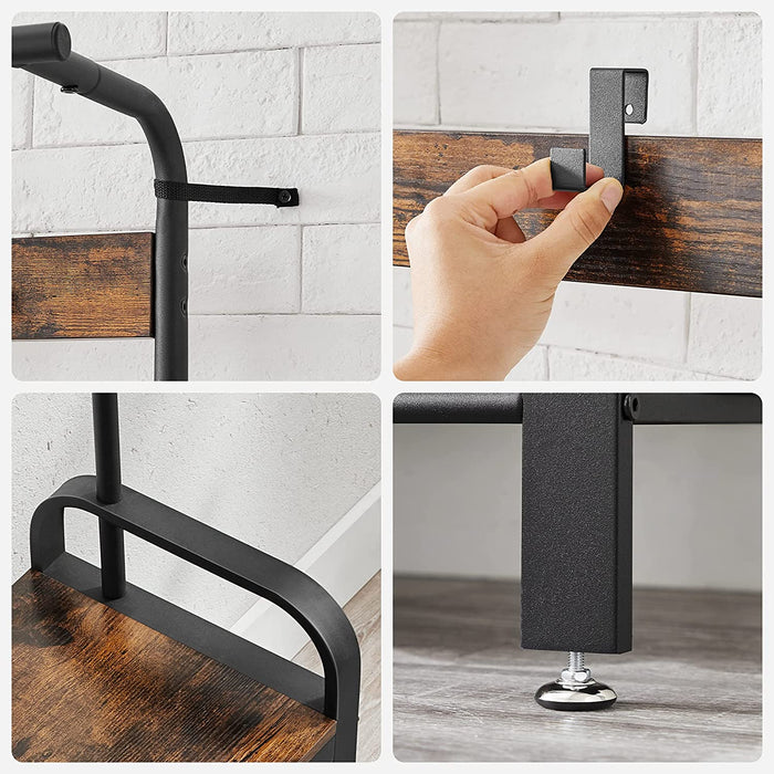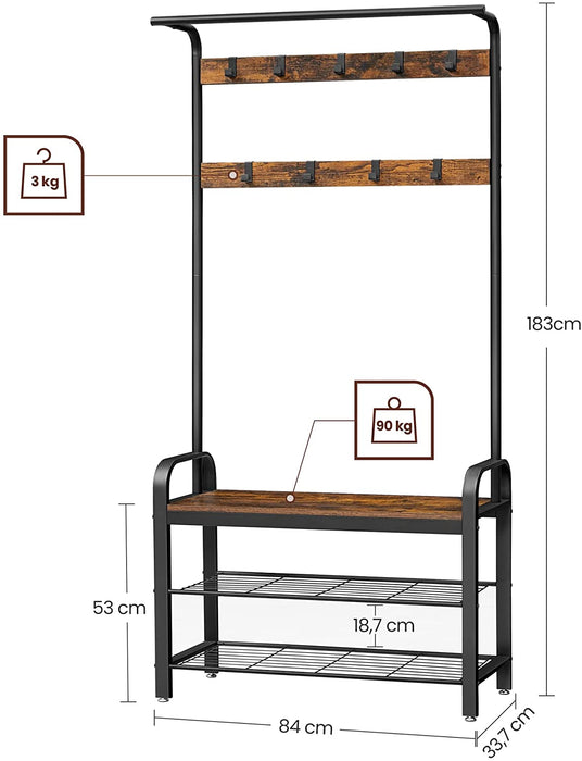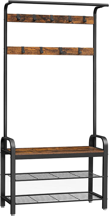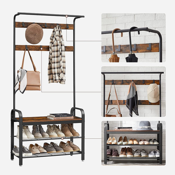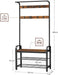 Garderobenständer, Garderobe, Schuhregal mit Sitzfläche, Kleiderständer mit 9 abnehmbaren Haken, Sitzbank, Industrie-Design, vintagebraun-schwarz