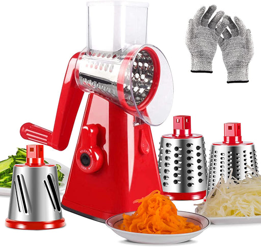Original Preis €56,90Derzeitiger Preis €39,90Trommelreibe Gemüseheobel, Käsereibe mit 3 Edelstahl Trommeleinsätze Manuelle Gemüseschneider für Käse, Gurken, Karotten-Schnittfeste Handschuhe