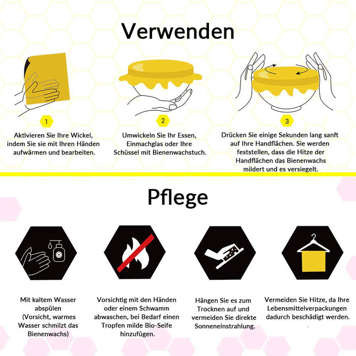 • NACHHALTIGES PRODUKT nach der Verwendung waschen sie das Bienenwachstuch einfach mit kalten Wasser aus und geben sie gegeben Falls ein bisschen Spülmittel hinzu.