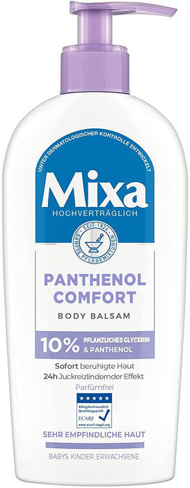Sehr empfindliche, juckende Haut braucht eine beruhigende Pflege: der Panthenol Comfort Body Balsam von Mixa beruhigt sehr sensible Haut sofort und langanhaltend. Angereichert mit pflanzlichem Glycerin und Panthenol, mildert der Körperbalsam Juckreiz für bis 24 Stunden. Die Pflege beruhigt gereizte Haut, spendet ihr intensiv Feuchtigkeit und stärkt die Hautbarriere. Dank der ausgewählten Inhaltsstoffe und einer parfümfreien Formel ist der Body Balsam hochverträglich und auch für Babys geeinget.