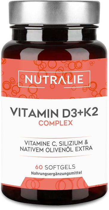 KOMPLETTE FORMEL MIT VITAMIN C, SILIZIUM UND NATIVEM OLIVENÖL. Die Vitamin D3+K2-Formel von Nutralie wurde speziell entwickelt, um die perfekte Ergänzung der Vorteile beider Vitamine zusammen auszunutzen. Darüber hinaus werden Vitamin D3 und K2 von Nutralie mit den Vorteilen von Vitamin C, Silizium und extra nativem Olivenöl ergänzt.