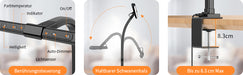 - Die Klemme zur Befestigung an Ihrem Schreibtisch verfĂŒgt ĂŒber Schrauben, die nach oben oder unten verschoben werden können, um einen schmaleren oder breiteren Schreibtisch einzustellen. Es unterstĂŒtzt eine Desktop-Dicke von bis zu maximal 8.3cm und spart so wertvollen Platz auf dem Schreibtisch