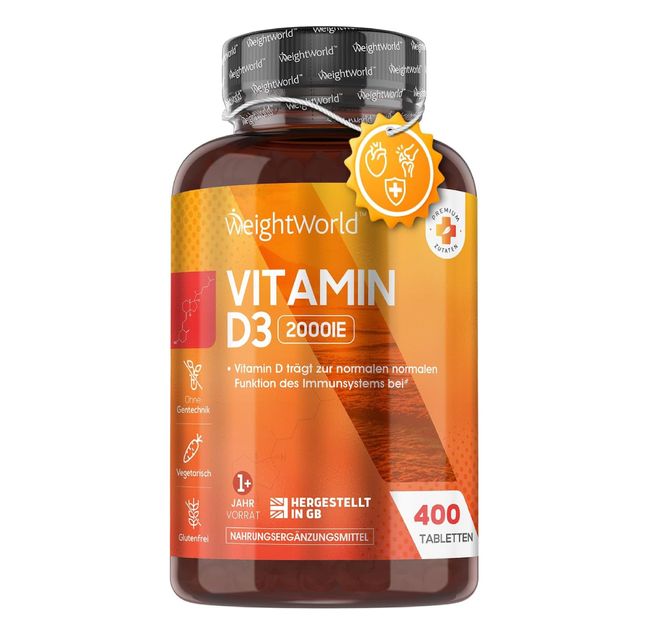 Erhalten Sie Ihre tägliche Dosis Vitamin D3 - Vitamin D ist als Sonnenvitamin bekannt und unterstützt den ganzen Körper. Eine Vitamin D Tablette enthält 2000 I.E. Cholecalciferol. Die empfohlene Tagesdosis für Deutschland ist 1000 I.E., somit benötigen Sie 1 Tablette alle 2 Tage. Sie sind besonders klein und dadurch leicht zu schlucken. Mit 400 Tabletten pro Packung haben sie einen besonders langen Vorrat von mehr als 2 Jahren.